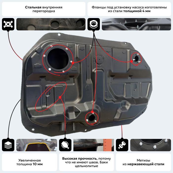 Бак повторяет геометрию оригинального бака и имеет те же габаритные размеры, крепежные и посадочные места. Фланец погружного модуля изготовлен из стали толщиной 4 мм со шпильками крепления погружного модуля М5х25 мм.