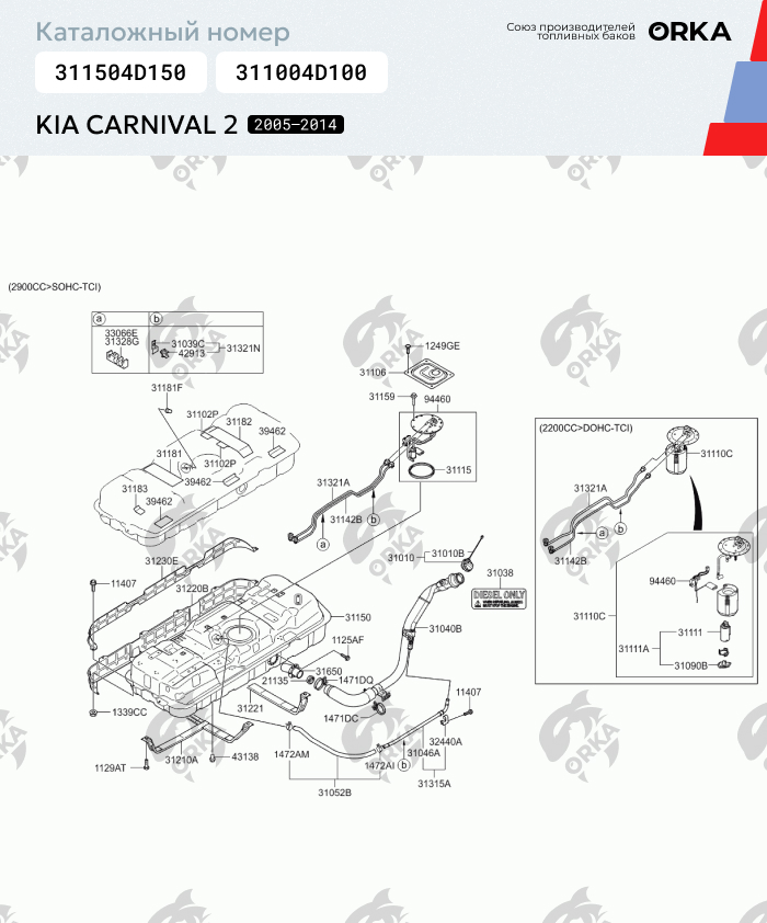 Пластиковый Топливный бак Kia Carnival 2, 2005 - 2014 г.в. (NB) (Киа / Кия Карнивал 2) каталожный номер 311504D150, 311004D100 изготовлен по методике цельного литья. Цельно литые баки в отличие от составных не имеют протечек, а значит существенно ниже риск течи топлива. Толщина стенки бака составляет 10 миллиметров, что в свою очередь дает более крепкую конструкцию в целом и надежность при ударах. Бак полностью соответствую оригинальным заводским бакам - форма, размер, расположение технологических отверстий и пазов для креплений! Замена старого бака на новый пройдет без всяких проблем. Внутри бензобака установлены перегородки по заводским чертежам, чтобы избежать неравномерного распределения топлива. Снаружи бака уложены медные трубки для подключения топливной магистрали, а также воздуха. Бак прошёл официальную сертификацию по стандартами ГОСТ Российской Федерации!